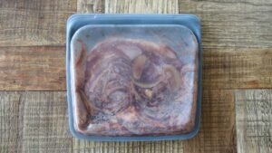 - 保存袋に①、スライスした玉ねぎ、調味料を合わせ揉み込む。
