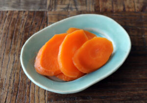 - 人参をななめ薄切りにし、レンジで1分加熱する。