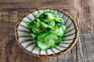 - キュウリは薄い輪切りにし塩ひとつまみ揉み込んで、レンジ600wで1分ほど加熱する。