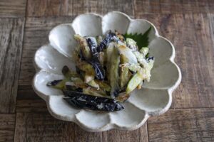 - 玉ねぎは薄切りし、茄子は細切りして水に浸し、アク抜きする。