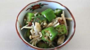 それでは、エノキとオクラの梅おかかポン酢あえを紹介します。