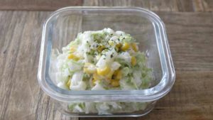 - 冷凍コーンは電子レンジ600w1分加熱し、解凍する。