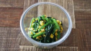 - フライパンにバターをいれ、冷凍コーンとほうれん草をいれます。
