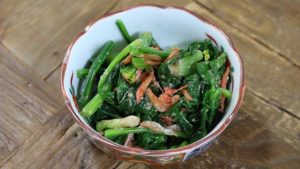 それでは、ほうれん草と桜エビの胡麻和えを紹介します。