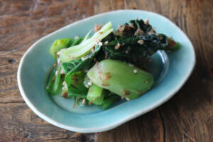 - 小松菜をざく切りし、レンジ600wで1分半ほど加熱する。