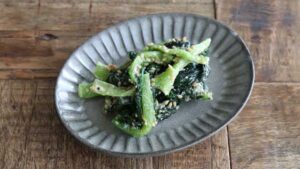 - 水分を拭き取り、ゴマダレとすりごまで和える。
