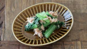 - 小松菜を食べやすい大きさにカットし、よく洗ってレンジ600wで1分半ほど加熱する。