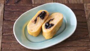 - 卵焼き器に油を引き、①の1/3量を流し入れ昆布の佃煮をのせ巻いていく。