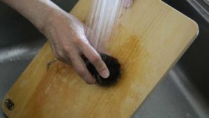 水を流しながらタワシで、ゴシゴシと木の目にそってこするように洗います。