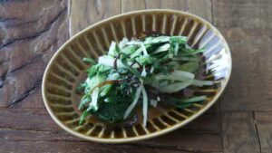 - 水菜は食べやすくざく切りにし、レンジで1分半ほど加熱する。