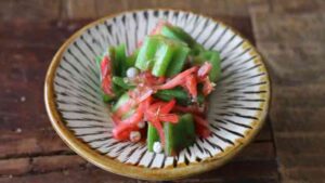 - オクラはガクを剥いて板ずりし、電子レンジ600wで40〜50秒加熱。