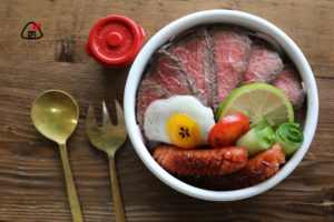 - 牛肩ロース肉は、塩、ブラックペッパー、乾燥ハーブを揉み込み、袋に入れて30分ほど室温に置く。