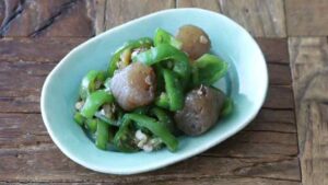 にぎりっ娘。それでは、こんにゃくとピーマンのピリ辛炒めを紹介します。