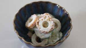 - ④を1cmほどの厚さの輪切りし、隙間があるようなら肉だねをスプーンでギュッと押し込むように詰める。