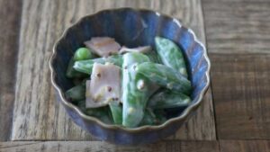 それでは、スナップエンドウとハムのマヨマスタード和えを紹介します。
