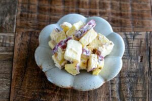 - さつまいもを1cmほどの角切りし、水に浸しながら何度か水をかえてアク抜きする。