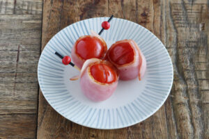 - ベーコンを横半分にかっとし、ミニトマトを巻く。