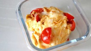 - 卵と調味料、ミニトマト、ミックスチーズを混ぜ合わせます。