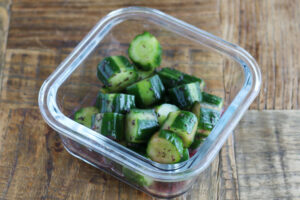 - ポリ袋に入れて塩でもみ、調味料を加えてさらに揉み込む。